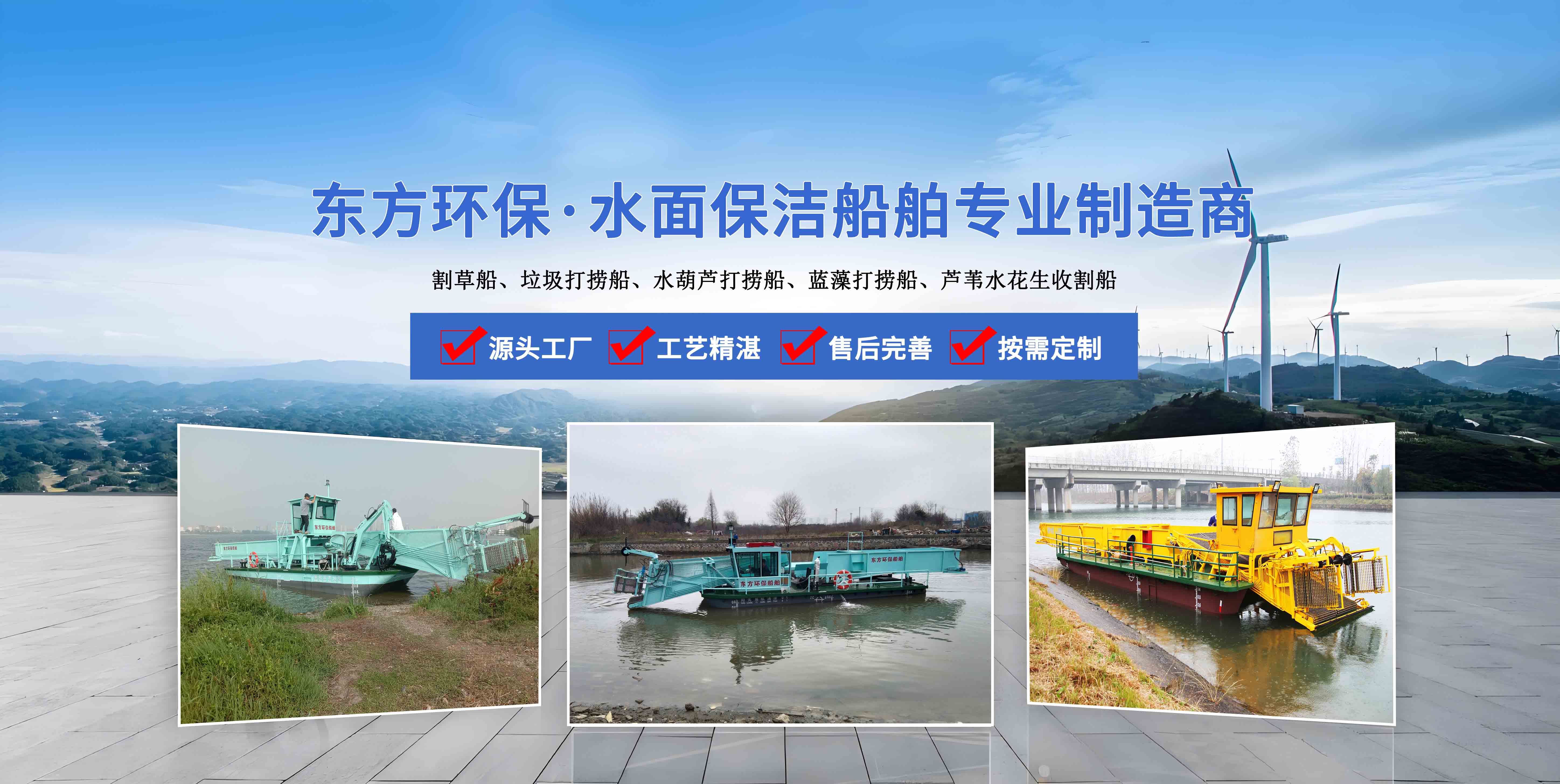 青州市東方環(huán)保機械制造有限公司位于山東省青州市,地理位置得天獨厚,是水面保潔船、水草收割船、、清漂船、滸苔打撈船、藍藻打撈船等水面船體的專業(yè)制造銷售廠家, 公司成立于2006年,公司先后與山東省黃河造船廠、中船重工702研究所、青島海洋大學、渤海船舶職業(yè)學院等機構建立了長期合作關系.。